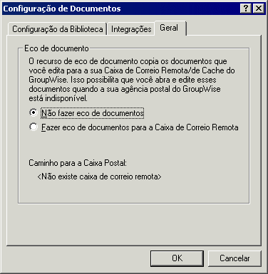 Depois de editar e fechar um ou mais documentos na Caixa de Correio Online, você poderá colocar uma cópia de cada documento editado na Biblioteca Remota. Esse procedimento é chamado de eco de documento. Assim, quando a rede, a Biblioteca do GroupWise ou a agência postal do GroupWise não estiverem disponíveis, você poderá abrir e modificar os últimos documentos editados no modo Remoto ou de Cache.