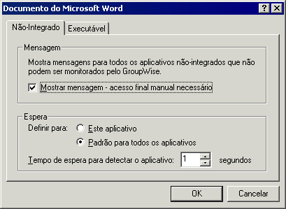 Você pode usar as opções da guia Não-Integrado nas opções de Integração Avançada para especificar se deseja ou não que o GroupWise mostre uma mensagem de aviso quando perder contato com um aplicativo não-integrado. Essa mensagem lembra você da necessidade de retornar o documento manualmente à biblioteca. Você também pode especificar quantos segundos deseja que o GroupWise espere para abrir aplicativos não-integrados.