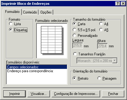 Para imprimir todas as informações do bloco de endereços de cada entrada, verifique se Endereço para Correspondência está selecionado na caixa de listagem Formulários Disponíveis.
