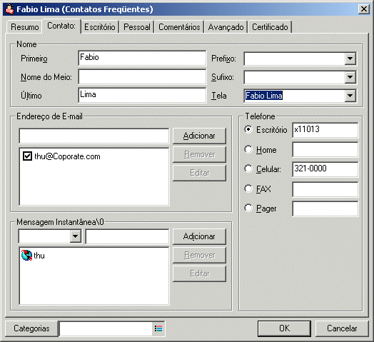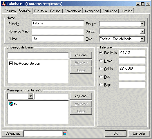 Use esta guia para digitar o nome do contato, vários endereços de e-mail, telefones e IDs de mensagem instantânea. Clique na lista suspensa Tela para selecionar o modo como deseja que o nome seja mostrado na Complementação de Nomes. Você pode selecionar Sobrenome, Nome, Nome Sobrenome ou pode digitar qualquer nome que escolher na tela. Quando quiser endereçar um item a esse contato, digite o nome da tela em um campo de endereço (Para, CC, CO) do item. Se você clicar duas vezes em um endereço de e-mail na guia Contato, uma nova tela de correio será aberta, endereçada a esse contato. Se você clicar duas vezes em um ID de mensagem instantânea de um produto suportado, o produto de mensagem instantânea será aberto (se estiver instalado) e uma conversação será iniciada com esse contato. Você pode especificar vários telefones. Selecione o botão de opção do telefone padrão. |