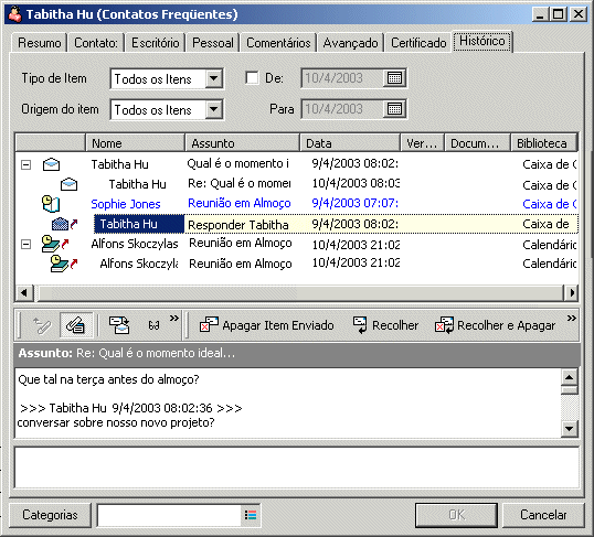 Use a guia Histórico para ver toda a correspondência trocada com um contato.
