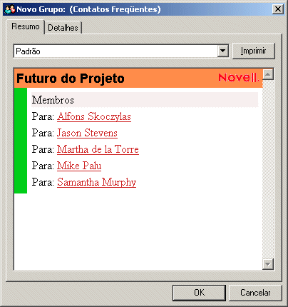 Use esta guia para digitar um nome para o grupo, uma descrição do grupo e ver quem está incluído no grupo. Você também pode selecionar um membro do grupo e pressionar Apagar para remover o nome. Se clicar o botão direito do mouse em um nome, você poderá ver detalhes, remover o nome ou mudar a designação de Para, CC e CO. Use o botão Membros para adicionar entradas ao grupo. Para obter mais informações, consulte Adicionando e removendo contatos de um grupo pessoal . |