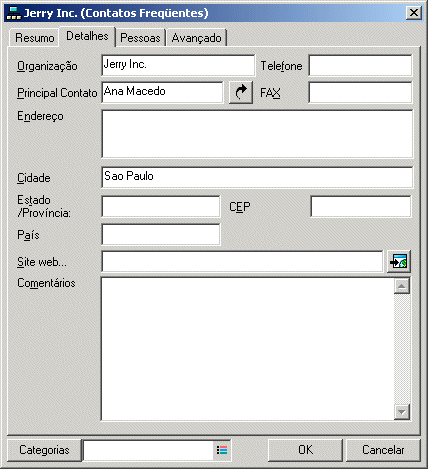 Use esta guia para digitar um nome para a organização, um número de telefone e de fax, o contato principal na organização, o endereço, o site na Web e comentários sobre ela. No campo Principal Contato, você pode digitar um contato que já esteja em seu bloco de endereços ou pode usar o botão com seta para criar uma nova entrada de contato. |