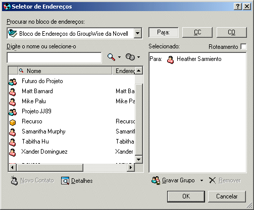 O Seletor de Endereços aparece em outros locais do GroupWise, por exemplo, quando você está selecionando membros de um grupo, entradas para um filtro ou uma pesquisa, e assim por diante. Ele pode ser um pouco modificado para mostrar somente opções apropriadas ao contexto.