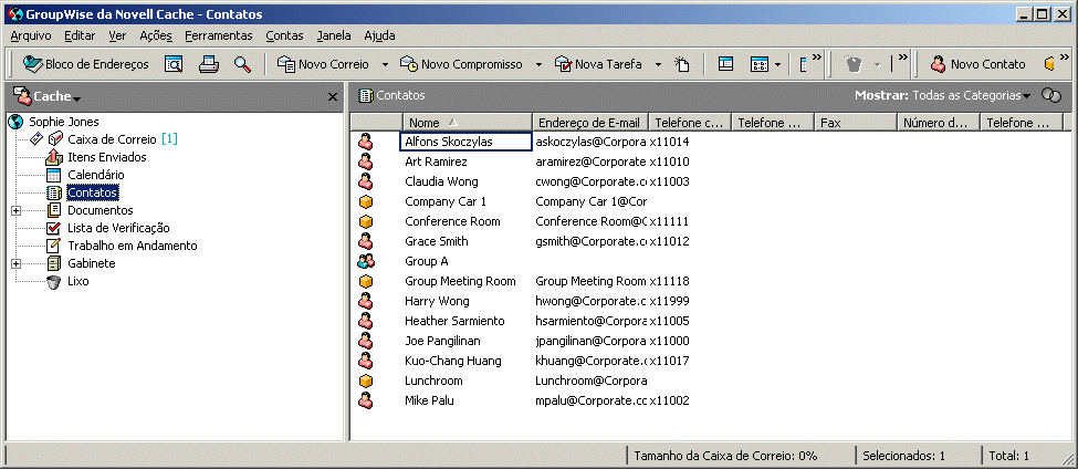 Embora o bloco de endereços Contatos Freqüentes seja criado pelo GroupWise, ele é considerado um bloco de endereços pessoal, pois você pode editar as informações sobre os contatos.