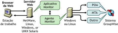 Agente Monitor: Esse agente faz poll continuamente em outros agentes do GroupWise (POA, MTA, Agente Internet, Agente WebAccess, assim como Agentes do Messenger e gateways), coleta informações de status sobre eles e as exibe no console do servidor Agente Monitor. O Agente Monitor também atende às solicitações de informações de status de agentes feitas pelo Aplicativo Monitor.