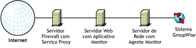 Se o firewall não fornecer um serviço de proxy, será preciso instalar o Aplicativo Monitor em um servidor Web que esteja fora do firewall. Como o Agente Monitor requer acesso direto (caminho mapeado, caminho UNC ou montagem do sistema de arquivos) a um diretório de domínio do GroupWise, ele deve ser instalado em um servidor que esteja localizado dentro do firewall.