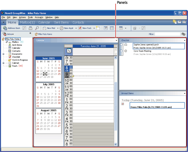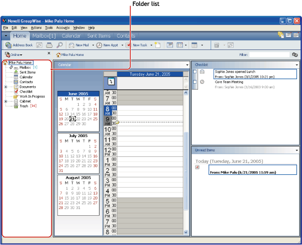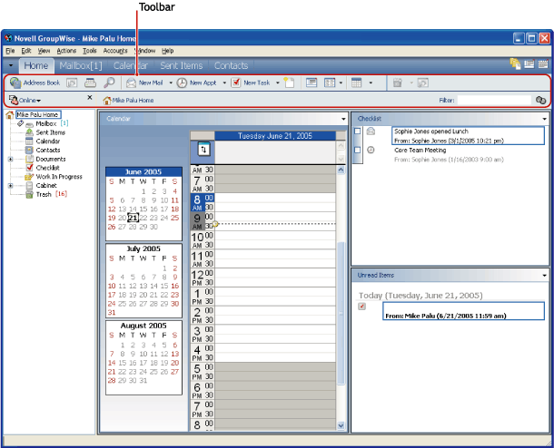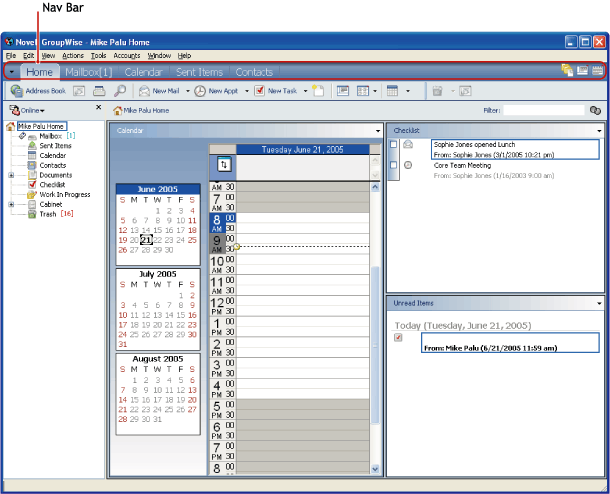 A área de trabalho principal do GroupWise é chamada Janela Principal. Na Janela Principal do GroupWise, você pode ler mensagens, programar compromissos, ver o Calendário, gerenciar contatos, mudar o modo de execução do GroupWise, abrir pastas e documentos e muito mais.
