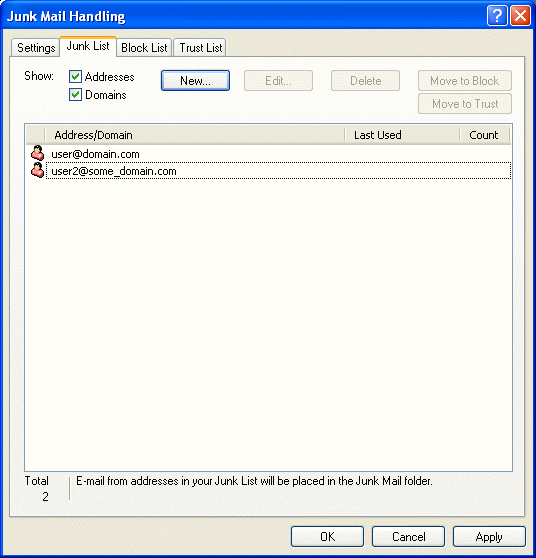 Para adicionar um endereço de e-mail ou um domínio da Internet a uma lista, clique em , digite o endereço de e-mail ou o domínio da Internet e clique em .