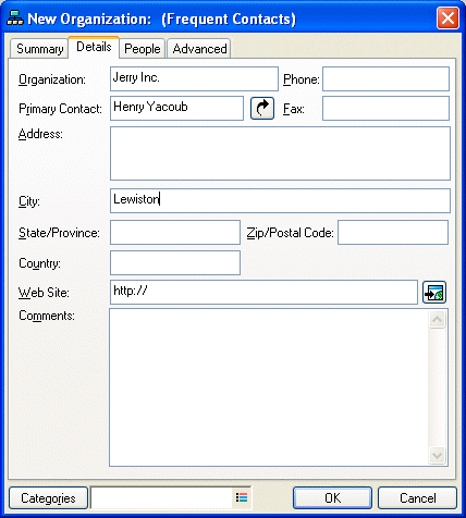 Utilize essa guia para digitar um nome para a organização, um número de telefone e de fax, o contato principal na organização, o endereço, o site na Web e comentários sobre ela. No campo Principal Contato, você pode digitar um contato que já esteja em seu bloco de endereços ou pode usar o botão de seta para criar uma nova entrada de contato. |