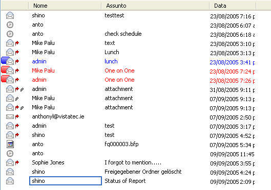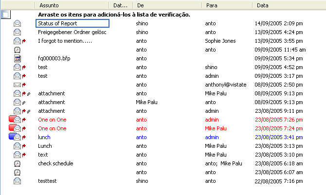 A opção Detalhes mostra uma lista dos seus itens e informações sobre eles em colunas, como Assunto, Data, CC, Prioridade, Tipo de Documento, Data de Término, Tamanho, Versão N# e várias outras categorias. Detalhes será a tela padrão da Caixa de Correio se você não tiver mudado as propriedades da sua Caixa de Correio. Para obter informações sobre como adicionar ou reorganizar colunas, consulte a Section 6.16, Utilizando as colunas da Caixa de Correio.