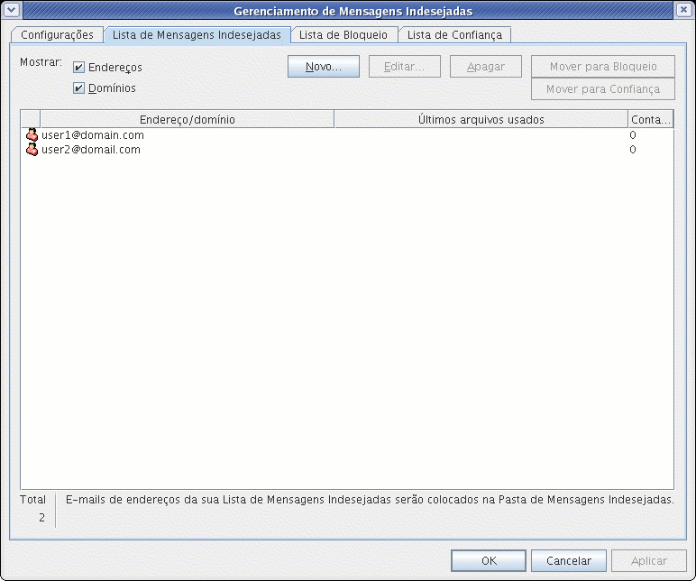 Figure 3-3 Caixa de diálogo Gerenciamento de Mensagens Indesejadas mostrando a guia Lista de Mensagens Indesejadas