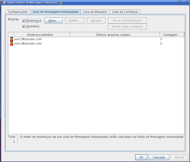 Além da Lista de Bloqueio e da Lista de Mensagens Indesejadas, há a Lista de Confiança. Use essa lista para adicionar endereços de e-mail ou domínios de Internet que você não deseja bloquear ou tornar indesejados, independentemente do que esteja especificado nas outras duas listas. Por exemplo, você pode ter example.com na sua Lista de Bloqueio, mas tem um amigo cujo endereço é myfriend@example.com. Adicione o endereço de e-mail desse amigo à Lista de Confiança.