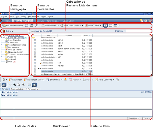A área de trabalho principal do GroupWise é chamada Janela Principal. Na Janela Principal do GroupWise, você pode ler suas mensagens, programar compromissos, ver o Calendário, gerenciar contatos, mudar o modo de execução do GroupWise em que está trabalhando, abrir pastas e documentos e muito mais.