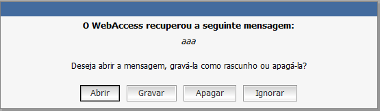 Ignorar: Retém as mensagens gravadas no disco mas não as recupera no GroupWise. Na próxima vez que o GroupWise for iniciado, a mesma janela é reexibida.
