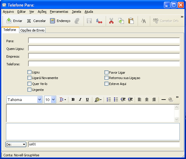 O GroupWise, o OpenOffice.org ou o Microsoft* Word pode ser usado como editor para compor uma mensagem no GroupWise. Se você usar o OpenOffice.org ou o Word como editor, a funcionalidade e a formatação do aplicativo estarão disponíveis na janela de edição do GroupWise.