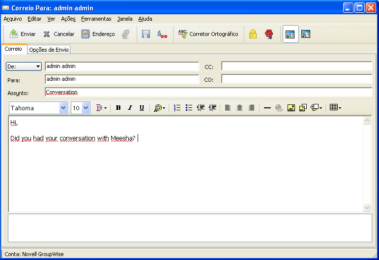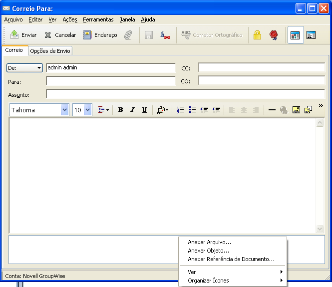 Ao enviar uma mensagem de e-mail do GroupWise, você pode enviá-la como texto ou HTML. Além disso, você pode optar por anexar um arquivo, adicionar uma assinatura ou vCard à mensagem e verificar a ortografia da mensagem antes de enviá-la.