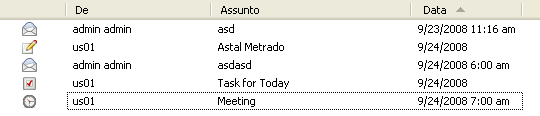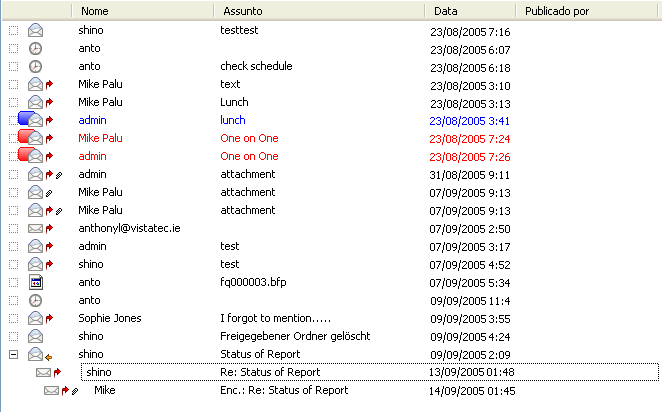A Lista de Itens em uma pasta divide-se em colunas. Cada coluna exibe informações sobre os itens da lista. Por exemplo, colunas diferentes exibem o assunto dos itens, a data em que foram enviados, etc. Você pode personalizar a exibição de colunas para cada pasta.