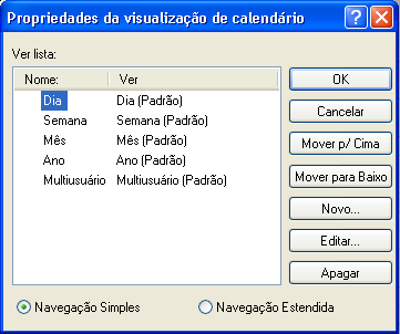A caixa de diálogo Propriedades da Visualização de Calendário permite mudar a tela usada para exibir os calendários Dia, Semana, Mês, Ano e Multiusuário.