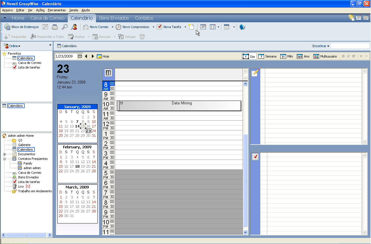 Agora, quando o calendário mensal for exibido, também serão exibidos, abaixo do calendário de compromissos do mês atual, todos os calendários mensais que caibam na janela do GroupWise.