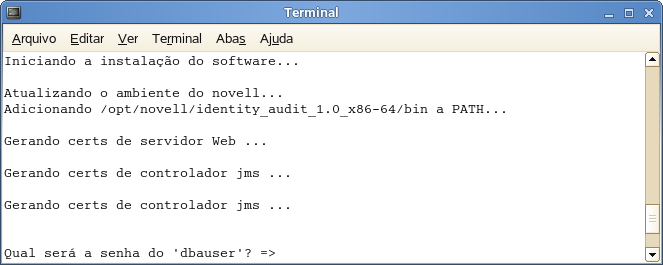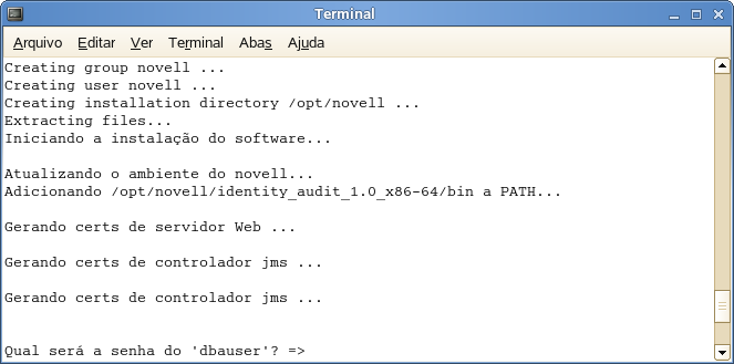O usuário novell e o grupo novell serão proprietários da instalação e dos processos de execução do Identity Audit.