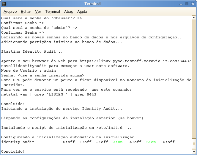 As credenciais do dbauser são usadas para criar tabelas e partições no banco de dados PostgreSQL. O Identity Audit está configurado para inicializar com os níveis 3 e 5 de tempo de execução (Modo Multiusuário com inicialização no console ou modo X-Windows).