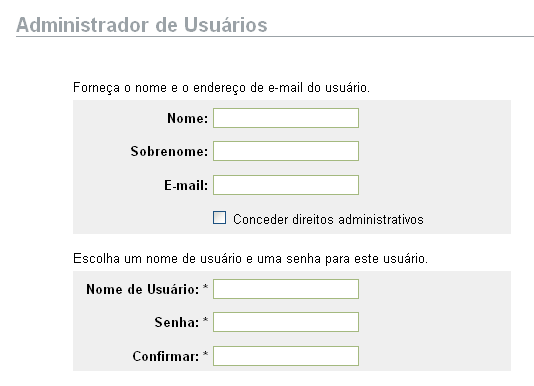 Os campos com um asterisco (*) são obrigatórios e o nome do usuário deve ser exclusivo.