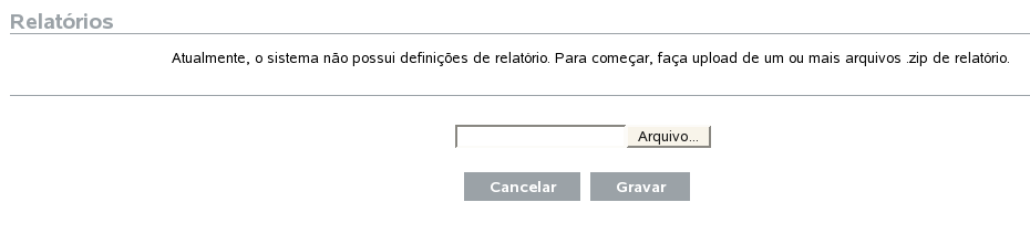 O Identity Audit vem pré-carregado com relatórios, mas os novos plug-ins de relatórios (arquivos .zip especiais que incluem a definição de relatório mais os metadados) podem ser carregados no Identity Audit. Se não houver relatórios no sistema, a seguinte tela será exibida:
