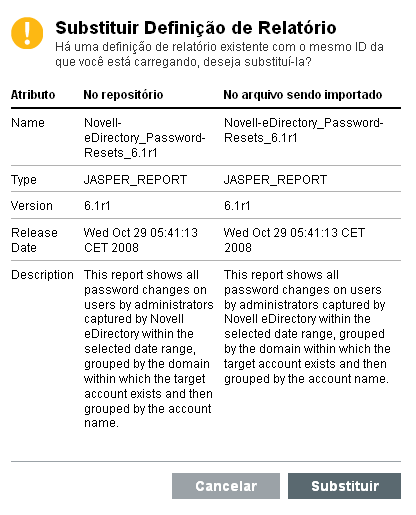 Os usuários podem fazer upload dos relatórios atualizados para o Identity Audit para substituir um relatório existente. Para obter mais informações, consulte a Seção 5.4.1, Adicionando Relatórios.