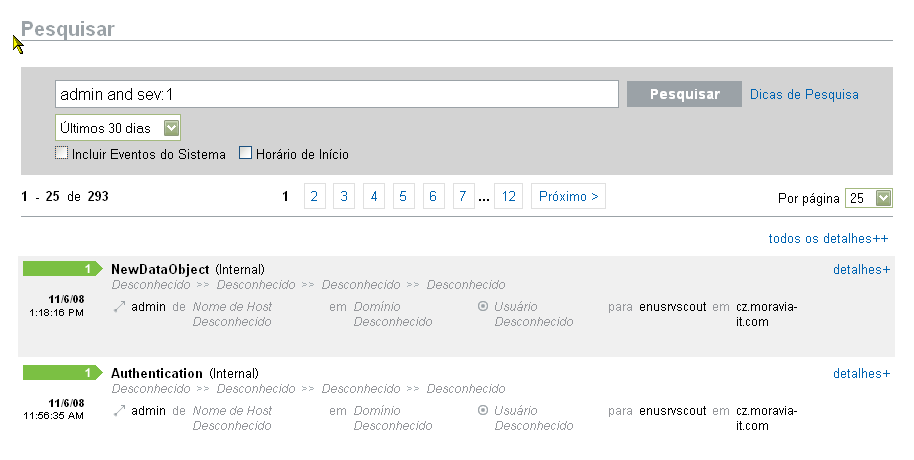 Para pesquisar um valor em um campo específico, use o nome abreviado do campo (para obter mais informações, consulte a Tabela 4-1), dois-pontos e o valor. Por exemplo, para pesquisar uma tentativa de autenticação do Identity Audit feita pelo usuário2, digite o seguinte texto no campo de pesquisa: