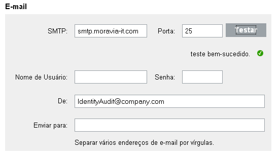Todos os eventos do Identity Audit que atendem aos critérios de filtragem para os quais uma ação Enviar para E-mail está definida são enviados para a mesma retransmissão SMTP e para o mesmo conjunto de endereços.