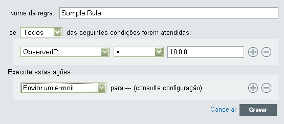As regras podem ser baseadas em qualquer campo de evento pesquisável. Para obter uma lista desses campos, consulte a Tabela 4-1. Os operadores disponíveis dependem do tipo de dados do campo de eventos. Por exemplo, match subnet está disponível para endereços IP e match regex está disponível para campos de texto.