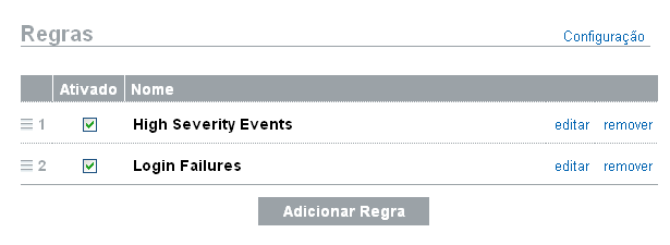 Como os eventos são avaliados por regras na ordem até que uma correspondência seja feita, a Novell recomenda ordenar as regras de forma adequada. As regras definidas de forma mais restrita e as regras mais importantes devem ser colocadas no início da lista. Quando há mais de uma regra, as regras podem ser reordenadas usando arrastar e soltar.