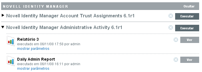 Para ver a lista de resultados do relatório, clique em . Todos os relatórios executados anteriormente são mostrados junto com o nome de relatório definido pelo usuário, o usuário que os executou e o horário da execução.