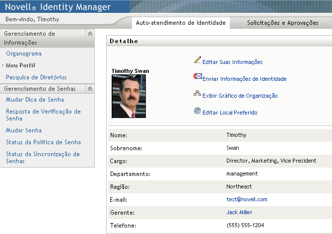 Veja a seguir um cenário que mostra como alguém pode se vincular aos detalhes de outro usuário ou grupo. Timothy Swan (Vice-presidente de Marketing) efetua login no Aplicativo do Usuário do Identity Manager e vai para a página Meu Perfil: