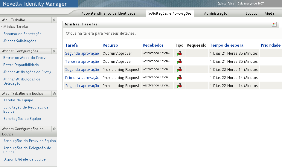 O lado esquerdo da guia Solicitações e Aprovações exibe um menu de ações que você pode executar. As ações são listadas por categoria (Meu Trabalho, Minhas Configurações, Meu Trabalho em Equipe e Minhas Configurações de Equipe):