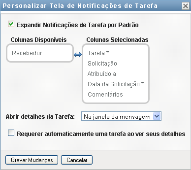 A seção Notificações de Tarefa da página Painel de Trabalho permite selecionar e anular a seleção de colunas, e também reorganizar as colunas na tela da lista de tarefas. Este comportamento é controlado por uma configuração da caixa de diálogo Personalizar Tela de Notificações de Tarefa.