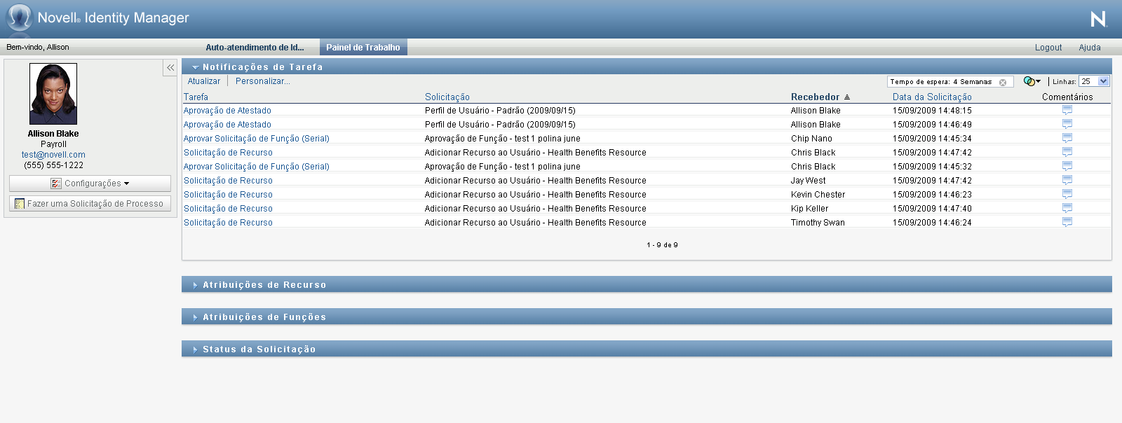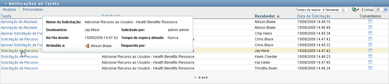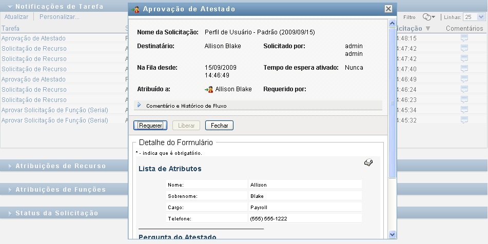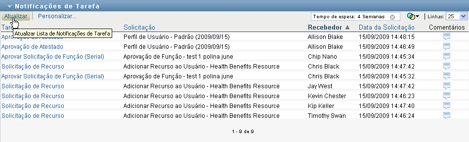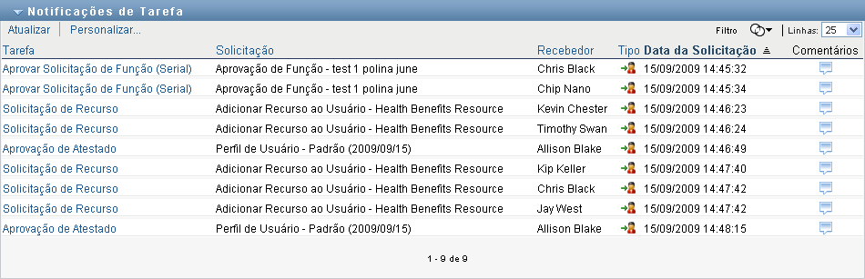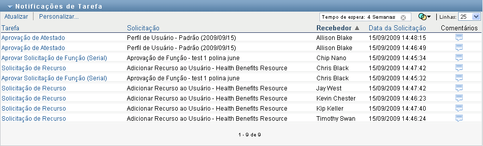 Para solicitações de recursos e funções, a coluna da lista de tarefas especifica o(s) usuário(s) ou o(s) grupo(s) que receberá(receberão) o recurso ou a função, caso as aprovações necessárias sejam dadas. Para solicitações de atestado, a coluna especifica o nome do atestador.