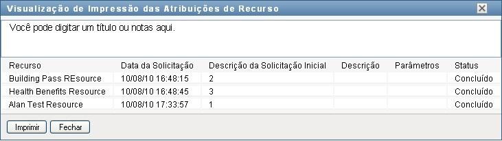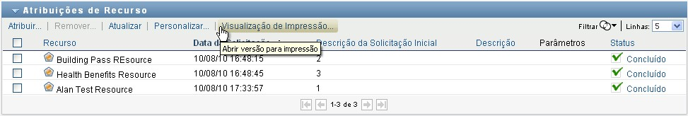 A seção Atribuições de Recurso do painel permite imprimir a lista das atribuições de recurso exibidas na página. O que você vê na tela é essencialmente o mesmo que aparece quando você imprime uma lista de atribuições de recurso, a diferença é que a impressão inclui apenas o texto da tela. As imagens mostradas na coluna Atribuído a ou na coluna Status não aparecerão na impressão.