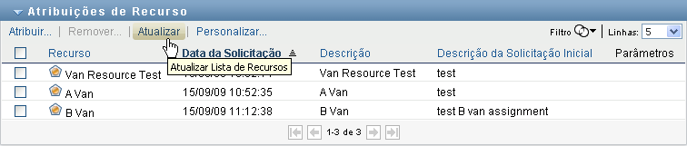 A lista de recursos é exibida. Se você não estiver no modo de gerenciamento, as atribuições de recurso mostradas serão aquelas para as quais é o recebedor. Se você estiver no modo de gerenciamento, as atribuições de recurso mostradas serão aquelas para as quais o usuário, grupo ou container selecionado é o recebedor. Para grupos e containers, os recursos listados são os atribuídos indiretamente ao grupo ou container selecionado por meio de atribuições de funções. A lista de atribuições de recurso para um grupo ou container não inclui os recursos atribuídos diretamente a um usuário do grupo ou container selecionado.