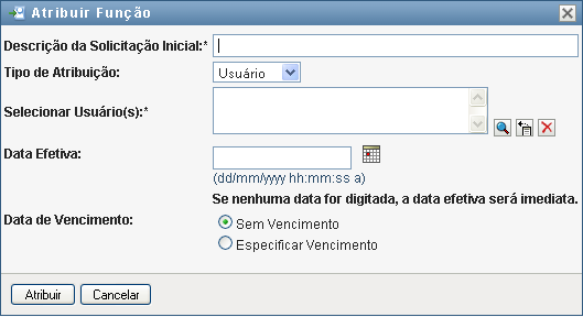 Para obter detalhes sobre como trabalhar com o formulário de solicitação de atribuição de função, consulte Atribuindo uma função do catálogo.
