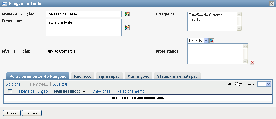 A ação da guia na interface do usuário do Identity Manager permite ver as funções que já foram definidas no catálogo. Ela também permite criar novas funções e modificar, apagar e atribuir funções existentes.