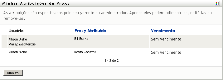 O Aplicativo de Usuário exibe suas configurações atuais. As atribuições de proxy exibidas são as que especificam você como proxy de outra pessoa, bem como as que especificam outra pessoa como seu proxy.