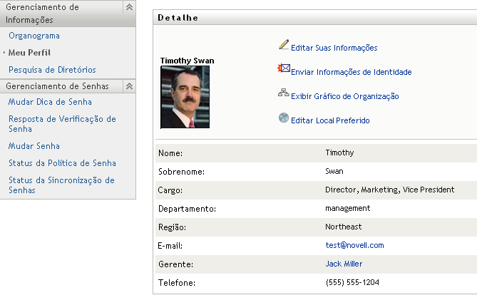 Veja a seguir um cenário que mostra como alguém pode se vincular aos detalhes de outro usuário ou grupo. Timothy Swan (Vice-presidente de Marketing) efetua login no Aplicativo de Usuário do Identity Manager e vai para a página Meu Perfil: