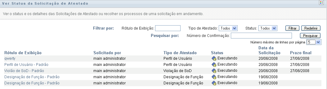 O Aplicativo de Usuário não impõe nenhuma restrição sobre o que o Administrador de Conformidade pode ver na página Ver Status da Solicitação de Atestado. Essa função permite acesso às informações de status sobre todas as solicitações de atestado.