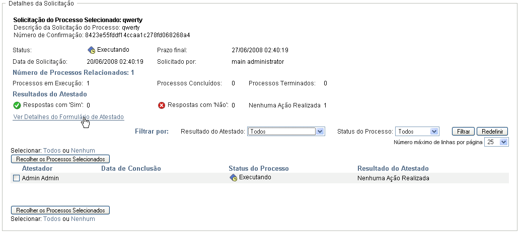 A ação permite ver o status das suas solicitações de atestado. Além disso, dá a opção de ver o status detalhado de cada processo de workflow iniciado para uma solicitação e opcionalmente recolher um ou mais processos em andamento.