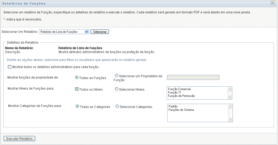 Escolha no menu suspenso e clique em . A página Relatórios de Funções solicita que você selecione os parâmetros a serem incluídos no relatório.