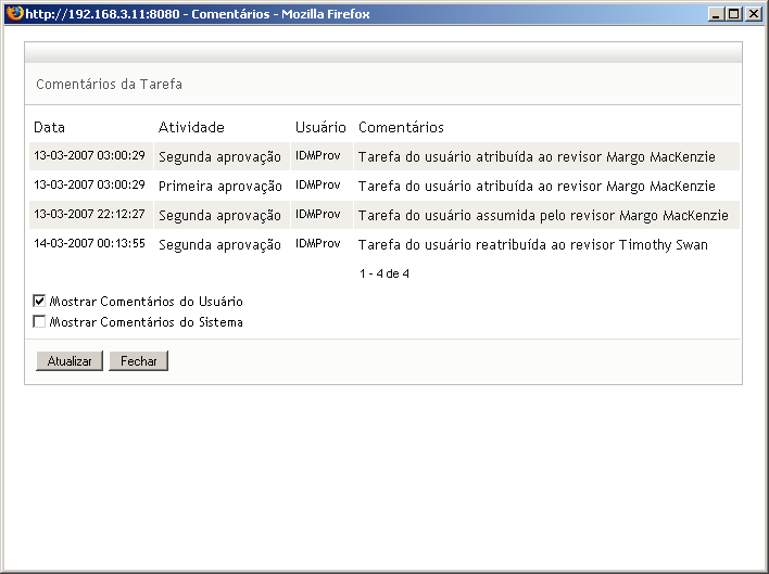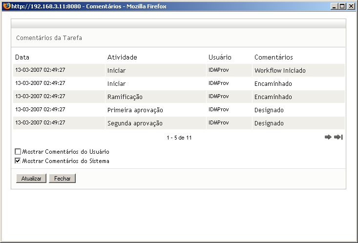 Uma janela popup permite ver os comentários de usuários e do sistema. A ordem em que os comentários aparecem é determinada pela marcação de horário associada a cada comentário. Os comentários inseridos primeiro são exibidos primeiro. Para fluxos de aprovação paralelos, a ordem de atividades processadas simultaneamente pode ser imprevisível.