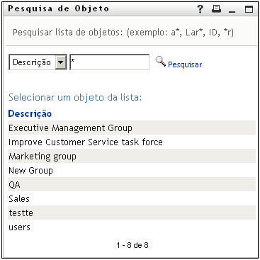 Clique em um nome de usuário ou de grupo para selecioná-lo. O exemplo a seguir da página de pesquisa de objeto foi uma pesquisa realizada de todos os grupos: