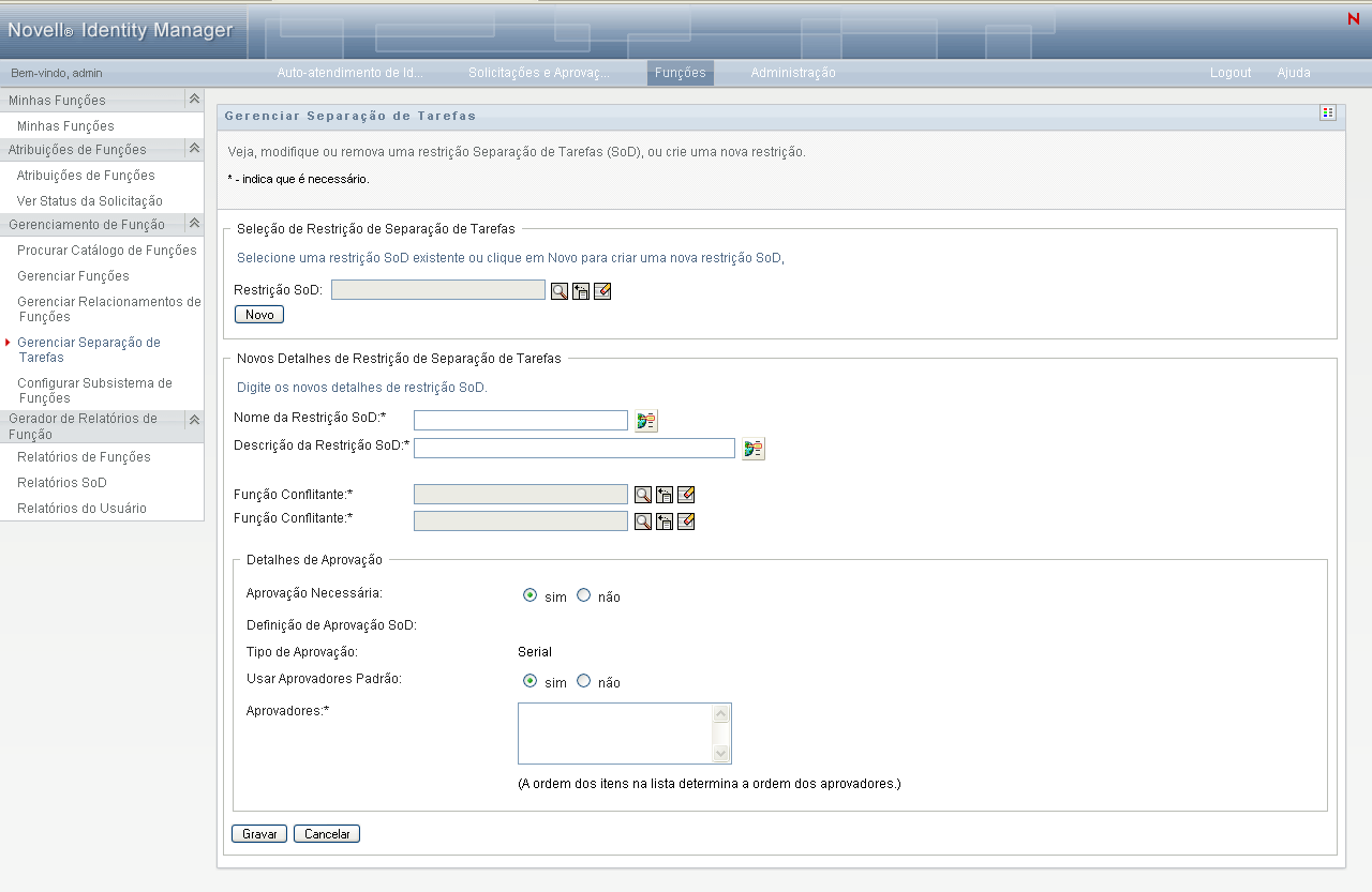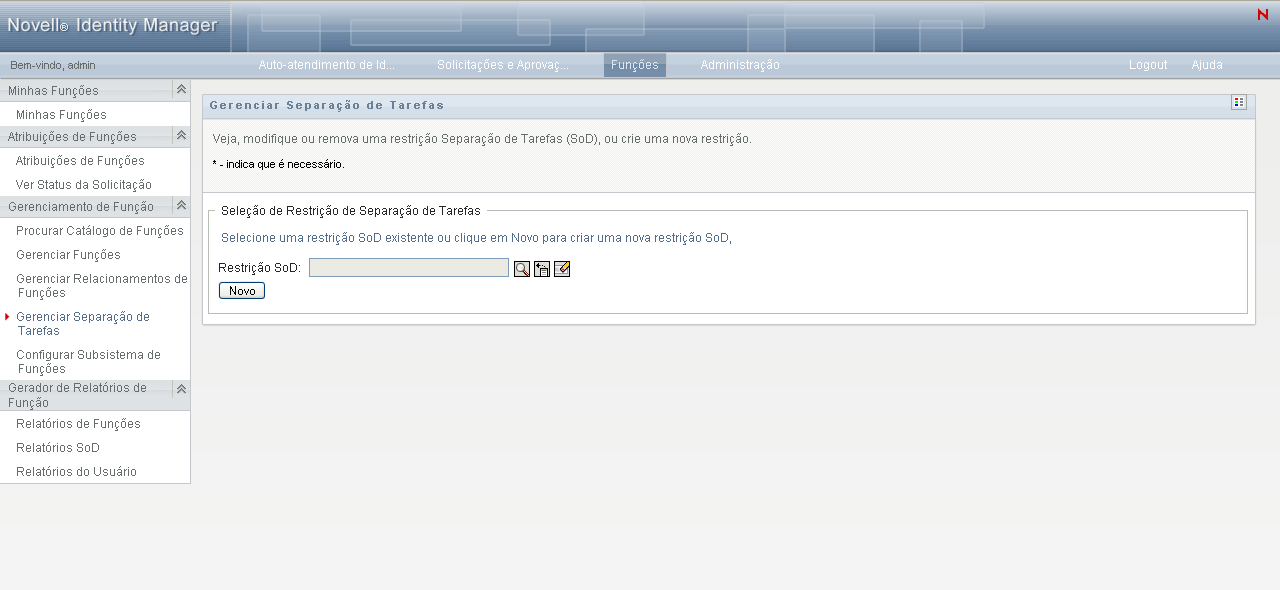 Acesso à página A página Gerenciar Separação de Tarefas pode ser acessada pelo Administrador de Função ou pelo Gestor em Segurança. O Gestor em Segurança requer direitos Procurar para o container SoDDef no Identity Vault, mas não requer esses direitos para as funções.